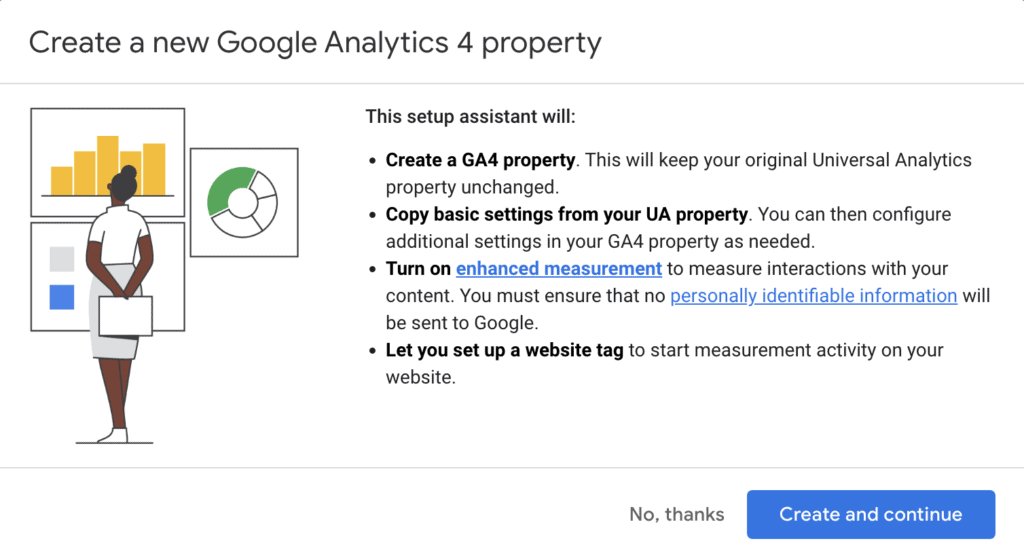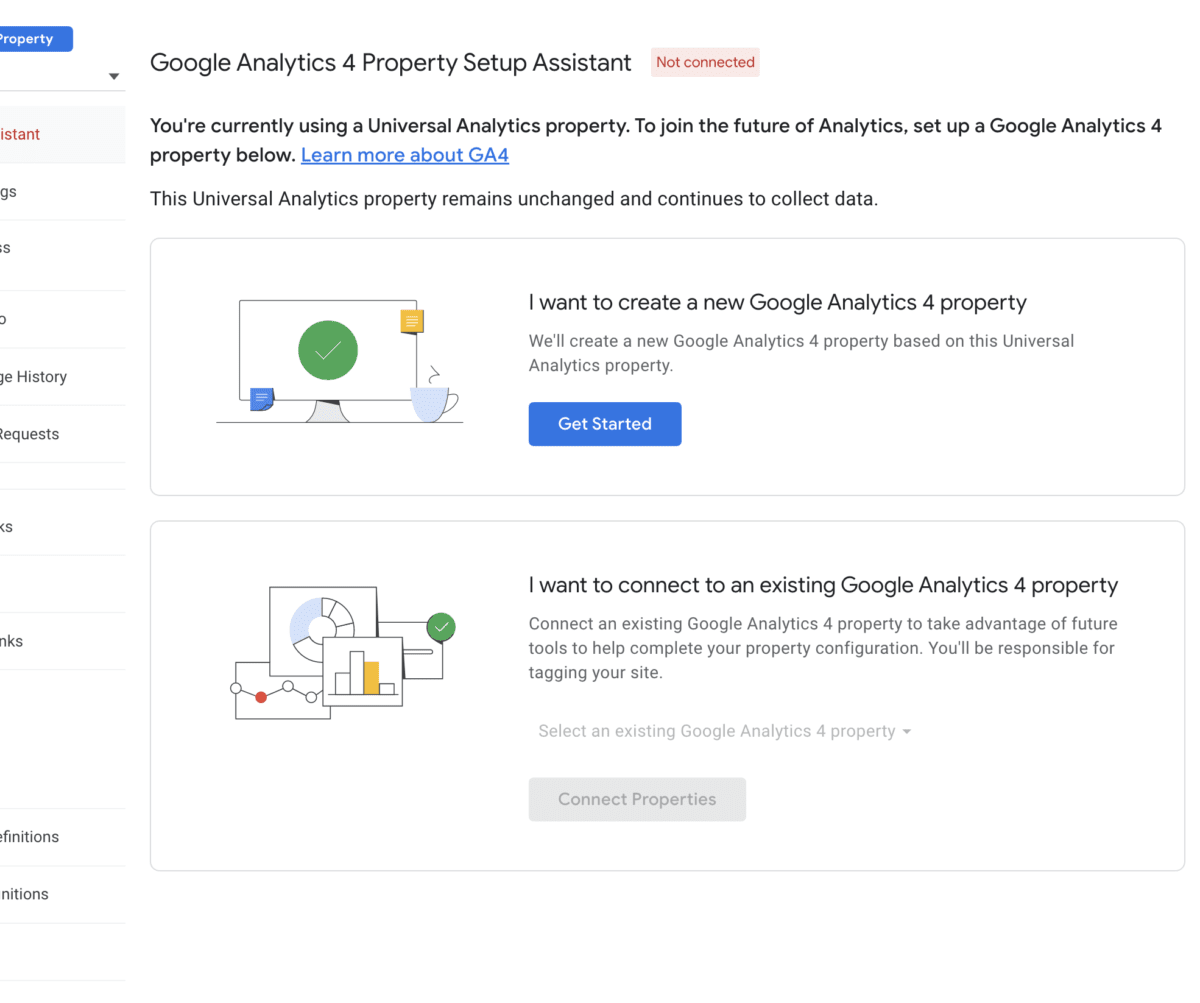 - The GA4 setup assistant will not backfill the property with historical data, which is why it’s essential to get this up and running ASAP to start data collection.