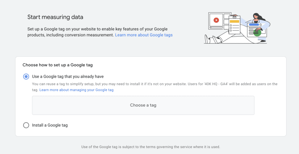 - Use the Google tag found on your website (this is the recommended option and will allow you to complete the setup without having to alter your site’s code)